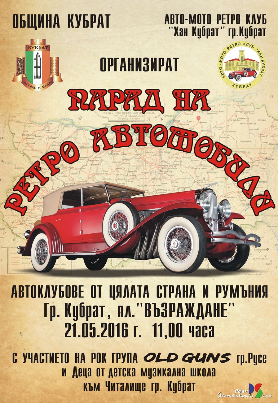 Екипът на Авто-мото ретро клуб „Хан Кубрат” гр. Кубрат и Община Кубрат канят всички собственици на стари (над 30 години) ретро автомобили от страната и чужбина да се включат в ПЪРВИЯ ПАРАД НА РЕТРО АВТОМОБИЛИ в гр. КУБРАТ, който ще се проведе на 21.05.2016 г. от 11:00 ч. на площад „Възраждане”, под патронажа на кмета на Общината г-н инж. Бюрхан Исмаилов. За ведрото ви настроение, организаторите са подготвили програма с участието на рок група OLD GUNS гр. Русе и деца от детската музикална школа към Читалище - гр. Кубрат. Ще има и много изненади!